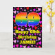 Die Vorderseite dieses lustigen und farbenfrohen Geburtstagskarten-Designs zeigt eine große Zahl "69" mit einem inspirierten Regenbogenspektrum-Gefälle, zusammen mit der Meldung "Happy 69th Birthday" und einem personalisierten Namen. Der Hintergrund der Vorderseite ist mit rosa, roten und lila Herzformen unterschiedlicher Größe gestaltet. Die Innenseite hat eine bearbeitbare Geburtstagsgrüßnachricht, oder könnte gelöscht und leer verlassen werden, wenn eine Nachricht stattdessen von Hand geschrieben werden soll. Eine glückliche, maßgeschneiderte Geburtstagskarte wie diese könnte verwendet werden, um den neunundsechzigsten Geburtstag von jemandem zu bestätigen. [~Z0000551]