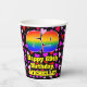 Dieses lustige und fröhliche Geburtstags-Thema Papier Becher Design zeigt eine große Zahl "69" mit einem Regenbogenspektrum inspirierte Muster. Es enthält auch die Meldung "Happy 69th Birthday", und einen personalisierten Namen. Der Hintergrund weist eine lila, rosa und rote Herzform auf. Fröhliche, optimistische Tassen wie diese könnten Spaß machen, bei einer Geburtstagsfeier, die zur Feier des neunundsechzigsten Geburtstages von jemandem abgehalten wird. [~Z0000548]