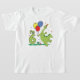 Scherzt Liebe dieser niedliche grüne Dinosaurier mit Ballonen Ihren 6. Geburtstag der Kinder mit Text feiernd, der "mich sind 6" liest.
