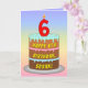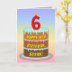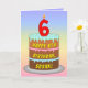 Dieses fröhliche und optimistische Geburtstagskartendesign zeigt eine Cartoon-Darstellung eines dreistufigen Geburtstagskuchens mit einer numeralförmigen Kerze oben, die die Zahl "6" zeigt, sowie die Meldung "GLÜCKLICH 6. BIRTHTAG" und einen benutzerdefinierten Empfängernamen. Der Hintergrund der Vorderseite hat ein mehrfarbiges, pastellfarbenes Regenbogenspektrum, inspiriert Farbverlauf. Die Innenseite hat eine personalisierte Geburtstagsgrüßbotschaft, oder könnte gelöscht und leer verlassen werden, wenn eine Nachricht von Hand geschrieben werden soll. Eine lustige, personalisierte Geburtstagskarte wie diese könnte eine lustige Art sein, jemandem, der seinen sechsten Geburtstag feiert, Geburtstag zu schenken. [~Z0000625]