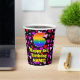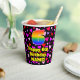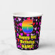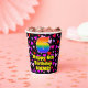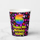 This cheerful and happy birthday-themed paper cup design features a large number “6” having a rainbow spectrum gradient inspired pattern. It also features the message “Happy 6th Birthday,”, and a custom name. The background features a pattern of red, purple, and pink heart shapes. Loving, friendly paper cups like this might be fun to have at a birthday celebration being held in celebration of somebody’s 6th birthday. [~Z0000548]