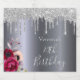 A label for a 70th birthday party. Dark falsch silver metallic looking background. Decorated with dark purple and burgundy and rose pink flowers, falscher Silver glitter dripping, paint drip look. Templates for a name. The text: 70th Birthday is written with a large modern hand lettered style script.