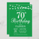 70. Geburtstag Einladung mit String Lights. Grüner Hintergrund. Männer oder Frauen zum Geburtstag. 13. 15. 16. 18. 20. 21. 30. 40. 50. 60. 70. 80. 90. 100. Jedes Alter. Für weitere Anpassungen klicken Sie bitte auf die Schaltfläche "Anpassen" und verwenden Sie unser Designwerkzeug, um diese Vorlage zu ändern.