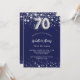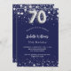 Eine moderne, stilvolle und glamouröse Einladung zu einer 70. Geburtstagsfeier. Ein marineblau-blauer Hintergrund, mit Imitaten verziert, die silberne Sterne tragen. Personalisieren Sie Ihren Namen und Ihre Party-Daten und fügen Sie diese hinzu. Nummer 70 wird mit einem Schriftart im Ballonstil geschrieben.