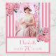 Ein Label für eine lustige 70. Geburtstagsfeier. Klassische, schmale rosa und weiße Streifen als Hintergrund. Mit mädchenhaften und femininen Blume, rosa Rosen und Pfannkuchen als Dekoration. Ein Rahmen vorne mit Vorlage für 70 Jahre, Name und Datum. Vorlage für Ihr eigenes vertikales Foto.