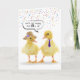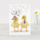 Niedliche gelbe Enten mit Sprachblase und Konfetti aus Party auf weißem Hintergrund zum 70. Geburtstag. Die Girl-Ente trägt eine Perlenkette und eine Motorhaube. Junge Ente trägt eine gestreifte Krawatte. Alle Texte können geändert werden. Alter ist essbar. Die Hintergrundfarbe kann geändert werden.