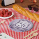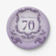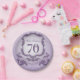 Design im Wappen-Stil in lila Farben mit großer 70. + "BIRTHDAY FEIERUNG" auf einem Band. Design auf Party Papierplatte mit Namen. Sie können den Namen (Farbe, Schriftart, Größe und Position) einfach ändern, indem Sie auf die Schaltfläche Anpassen klicken. Erhältlich mit Design für 60., 80., 90., 95. Geburtstag. Matching Party Papier Serviette, Geburtstagseinladung, Geburtstag Save the Date, Geburtstagskarte (Spiralheft), Geschenkbox, Geschenktag, Kissen, Tasse und andere Geburtstagsgeschenke für Großmütter.