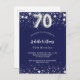 Eine moderne, stilvolle und glamouröse Einladung zu einer 70. Geburtstagsfeier. Ein marineblau-blauer Hintergrund, mit Imitaten verziert, die silberne Sterne tragen. Personalisieren Sie Ihren Namen und Ihre Party-Daten und fügen Sie diese hinzu. Nummer 70 wird mit einem Schriftart im Ballonstil geschrieben.