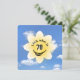 Eine Grafik mit weißer Blume mit leuchtendem Sonnenschein, Lächeln und Augenbrauen auf blauem Himmelshintergrund für eine 70. Geburtstagsfeier. Alle Texte können geändert werden.