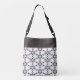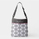 70er Retro Schwarz-Weiß-Blume Power Crossbody Bag. Niedliche farbenfrohe 70er Jahre Blume in Schwarz-Weiß mit rosa Akzent Muster. Sehr trendig mit diesem Retro-Feeling-Design. Einfach mit Namen für Sie oder einen Freund bearbeiten. Ein stilvolles, trendiges Geschenk für jede Frau.
