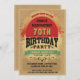 Funky 70th Birthday Party Einladungen zur Bewährung. Mens' or womens' colorful unisex vintage retro style personalised birthday party invites. Woman's or man's bitter personalized custom seventieth / seventy years / 70 year old birthday party celebration einladung with a beautiful, elegant, groovy, retro themed design with a grungy star burst vector illustration in red with ornate brown calligraphic / calligraphy swirls and flouristers hes ornaments and trendy retro typography / text design and green banners on tan / beige and yellow grunge background. Cool, modern, fashionable, design for men or women with a vintage style theme. These stylish, ordy, pretty, grunge, shabby chic invites are printed / decorated on both sides. PLEASE ANMERKUNG:- All Einladungen zu Zazzle have flat frühlings Bildern. If you need any assistance customizing your product, please contact me through my store and I will be happy to help.