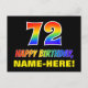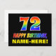 Die Vorderseite dieses fröhlichen, farbenfrohen und lustigen Geburtstags-Thema Postkartendesign zeigt eine große Zahl "72" und die Meldung "HAPPY BIRTHDAY", beide mit einem inspirierten Regenbogenverlauf, zusammen mit einem kühnen gelben benutzerdefinierten Empfängernamen. Die Vorderseite hat einen einfachen schwarzen Hintergrund. Auf der Rückseite der Postkarte befindet sich eine personalisierte Begrüßungsnachricht zum Geburtstag, oder sie könnte gelöscht und leer verlassen werden, wenn eine Nachricht von Hand geschrieben werden soll. Eine fröhliche personalisierte Geburtstagskarte wie diese könnte eine lustige Art sein, jemandes siebzigsten Geburtstag zu feiern. [~Z0000474]