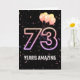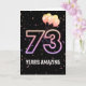 Party Ballons und Konfetti auf schwarzem Hintergrund mit der Neonnummer 73 für einen 73. Geburtstag.