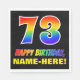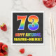 Dieses bunte, lustige und fröhliche Geburtstagsthema Papier Serviette Design zeigt eine große Zahl "73" und die Nachricht "GLÜCKLICH BIRTHTAG", beide mit einem inspirierten Regenbogenspektrum-Farbverlauf, zusammen mit einem kühnen gelben personalisierten Empfängernamen. Der Hintergrund ist schwarz. Spaß, personalisierbare Papierservietten wie diese könnten bei einem Party genutzt werden, um jemandes siebzigsten Geburtstag zu feiern. [~Z0000476]