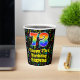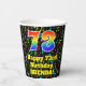 Dieses fröhliche und farbenprächtige Geburtstagspapier-Cup-Design mit einer großen Zahl "73" mit einem inspirierten Regenbogenspektrum-Gefälle, zusammen mit der Meldung "Happy 73. Geburtstag", und einem individuelle Name. Der Hintergrund weist ein lebendiges und farbenprächtiges Musiknoten- und Symbolmuster auf. Farbenfrohe, lebendige Papiertassen wie diese könnten sich bei einer Geburtstagsparty zur Ehrung von jemandem zum dreiundsiebzigsten Geburtstag amüsieren. [~Z0000541]