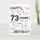 Geburtstagskarte Inside: Möge Ihr besonderer Tag mit Freude, Lachen und unvergesslichen Momenten gefüllt werden, die Sie für viele Jahre lieben können. Herzlichen Glückwunsch zum Geburtstag und immer an das Glück der Welt! Beschreibung: Wir erinnern an den unglaublichen Meilenstein des 73. Geburtstags mit unserer schönen Happy 73. Geburtstagskarte! Egal, ob es für Ihre Lieblingsmutter, Ihren geliebten Vater, lieben Bruder oder eine geliebte Schwester ist, diese Karte bietet eine schöne Möglichkeit, Ihre herzlichen Wünsche zu äußern und sie an ihrem besonderen Tag mit Freude und Liebe zu duschen. Die Vorderseite der Karte zeigt stolz "Happy Birthday" neben der signifikanten Zahl 73, die in Jahrzehnten, Jahren, Monaten, Wochen, Tagen, Stunden, Minuten und Sekunden dargestellt ist und die Bedeutung dieses bedeutsamen Ereignisses unterstreicht.