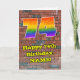 This fun and exciting urban graffiti and street art themed birthday greeting card design features a large number “74” having a colorful rainbow spectrum gradient inspired pattern. It also features the message “Happy 74th Birthday,”, and an editable name. The background of the front features a brick wall pattern. The inside has a custom birthday greeting message, or could perhaps be cleared and left blank if a message is to be written by hand instead. A colorful, personalized birthday greeting card like this might be used to celebrate somebody’s seventy-fourth birthday. [~Z0000586]