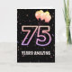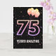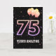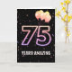 Party Ballons und Konfetti auf schwarzem Hintergrund mit der Neonnummer 75 für einen 75. Geburtstag.