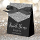 Diese fabelhafte moderne 75. Geburtstag Silber Glitzer Black Danke Ihnen Gefallen Box mit glitzerndem silberner Glitzer, Danke in einem trendigen Drehbuch-Schriftart und der Geburtstagsmädchen-Name in Silber mit einem eleganten schwarzen Bogen wäre perfekt für Ihre Veranstaltung. Es wäre toll für eine Süßwarenstation, auf einem Dankeschön-Tisch oder an jedem Ort mit einem Gefallen. Stellen Sie sicher, dass Sie genug für alle Ihre Gäste bestellen.