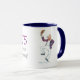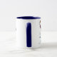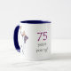Diese weiße Ringer-Tasse mit dunkelblauer Lippe und Griffel ist ein tolles Geburtstagsgeschenk für einen 75-Jährigen! Das Bild, die Rückseite und die Vorderseite sind ein "älterer Mann" Tanz, in einem Blazer und Boaterhut, aus einer Aquarelldarstellung von Judy Adamson. Zwischen den beiden Männern ist der Text - 75 Jahre jung!