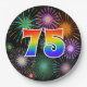 Dieses fröhliche, lustige und farbenfrohe Papier-Plattendesign zeichnet sich durch eine große Zahl "75" aus, die eine inspirierte Farbgebung des Regenbogenspektrums enthält. Es zeichnet sich auch durch ein lebendiges und aufregendes Feuerwerk inspiriert. Der Hintergrund ist schwarz. Teller wie diese können zum 75. Geburtstag eines Menschen, zum 75. Geburtstag oder zu einem anderen fünfundsiebzigsten Ereignis verwendet werden. [~Z0000490]