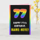 Dieses lebendige und fröhliche Geburtstagskarten-Design zeigt die Zahl "77" mit einem farbenfrohen Regenbogenspektrum inspiriert Farbverlaufsmuster, zusammen mit der Meldung "HAPPY 77. BIRTHDAY" und einem bearbeitbaren Empfängernamen. Im Inneren befindet sich eine individuell angepasste Geburtstagsgrüßbotschaft, oder man könnte sie löschen und leer verlassen werden, wenn eine Nachricht von Hand geschrieben werden soll. Eine fröhliche, personalisierte Geburtstagskarte wie diese wird geschickt, um jemandes siebenundsiebzigsten Geburtstag zu feiern. [~Z0000636]