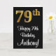 Dieses luxuriöse, elegante und raffinierte Geburtstagskarten-Design verfügt über eine große Ordnungsnummer "79.", die ein goldfarbenes Imitat nachahmt, sowie die Geburtstagsgrüßbotschaft "Happy 79. Geburtstag" und einen personalisierten Namen in einem Schriftart im Skriptstil auf der Vorderseite. Es hat auch einen schwarzen Hintergrund auf der Vorderseite. Die Innenseite hat eine individuelle Geburtstagsgrüßnachricht, oder könnte gelöscht und leer verlassen werden, wenn eine Nachricht von Hand geschrieben werden soll. Eine luxuriöse personalisierte Geburtstagskarte wie diese könnte eine lustige Art sein, jemandem, der gerade seinen neunundsiebzigsten Geburtstag feiert, Geburtstag zu schenken. [~Z0000518]