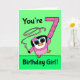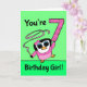 Unser kleiner Pinguinfreund wünscht sich einen ganz besonderen Gymnast zum 7. Geburtstag! Sie ist darstellend in ihrem rosa Leotard mit Band und balanciert einen großen rosa Konfetti Nummer 7. Kartenhintergrund ist ein lustiges Grün. Original Illustration von Bethany J. Mitchell von Darcy Place Studio.