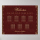 Eine Vintage, elegante Sitzkarte mit 7 Tischen, empfohlen für eine Hochzeit in Bordeaux und Goldfarben. Der Hintergrund ist bordeauxrot. Es hat Vintage goldene Dekorationen an den Rändern. Der gesamte Text ist golden. Das Wort Willkommen im oberen Teil und die Namen im unteren Teil sind in einem eleganten kalligrafischen Skript geschrieben, die Erholung in Kappen.