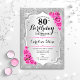 Einladung zum 80. Geburtstag. Elegantes Blumendesign in Silber und Rosa. Features Imitate Glitzer silberne Streifen, rosa Rosen stilvolle Skript-Schriftart und Konfetti. Ideal für eine gläserne Geburtstagsfeier.