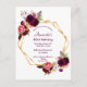 An Einladung für 80th birthday Party. A chic white background with an Gold geometric frame. Decorated with dark burgundy and pink watercolored flowers, roses and boho style feathers. Templates for a name and party details. The name is written with a hand lettered style script, burgundy colored letters. Back: white colored background.