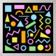 Muster im Stil der 80er Jahre in bunten Formen von grün, gelb, blau und gelb auf schwarzem Hintergrund.