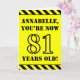 Auf der Vorderseite dieses Aufmerksamkeits- und lustigen Geburtstagskarten-Designs steht ein individualisierbarer Name und die Meldung "YOU’RE NOW 81 YEARS OLD!" in schwarzem Schablonentext auf gelbem Hintergrund. An den oberen und unteren Rändern der Vorderseite befindet sich ein auffälliges, gelb-schwarzes Streifen. Im Inneren befindet sich eine individuell anpassbare Geburtstags-Grußnachricht, oder vielleicht kann gelöscht und links werden, wenn eine Nachricht von Hand geschrieben werden soll. Eine personalisierte Geburtstagskarte wie diese ist vielleicht eine lustige Art, Geburtstagwünsche jemandem zu senden, der gerade seinen 81. Geburtstag feiert. [~Z0000413]