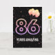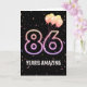 Party Ballons und Konfetti auf schwarzem Hintergrund mit der Neonnummer 86 für einen 86. Geburtstag.