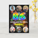 Die Vorderseite dieses aufregenden und optimistischen Geburtstagskarten-Designs zeigt eine große Zahl "86" mit einem lebendigen Regenbogenspektrum inspiriert Farbverlaufsmuster, zusammen mit der Meldung "HAPPY 86. BIRTHDAY" und einem personalisierten Namen auf einem bunten Feuerwerk inspiriert Muster. In der Nähe von oben und unten sind Bilder, die individuell angepasst werden können, vielleicht mit Fotos der Familie und Freunden des Empfängers. Die Innenseite hat eine individuelle Geburtstagsgrüßnachricht, oder könnte gelöscht und leer verlassen werden, wenn eine Nachricht von Hand geschrieben werden soll. Eine positive, personalisierte Geburtstagskarte wie diese könnte zum Feiern des sechsundachtzigsten Geburtstags verschickt werden. (Fotografie © Storytree Studios, Stanford, CA.) [~Z000660]