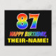 Die Vorderseite dieses bunten, fröhlichen und lustigen Geburtstags-Thema Postkartendesign zeigt eine große Zahl "87" und die Meldung "HAPPY BIRTHDAY", beide mit einem inspirierten Regenbogenspektrum-Muster, zusammen mit einem kühnen gelben, anpassbaren Empfängernamen. Die Vorderseite hat auch einen minimalen, einfachen, schwarzen Hintergrund. Auf der Rückseite der Postkarte befindet sich eine individuell anpassbare Geburtstagsgrüßnachricht, oder sie könnte gelöscht und leer verlassen werden, wenn eine Nachricht von Hand geschrieben werden soll. Eine lebendige personalisierte Geburtstagskarte wie diese könnte eine lustige Art sein, jemandes siebenundachtzigsten Geburtstag zu feiern. [~Z0000474]