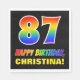 Dieses fröhliche, lustige und farbenfrohe Geburtstagspapierdesign weist eine große Zahl "87" auf und die Meldung "HAPPY BIRTHDAY", beide mit einem Regenbogenspektrum inspirierte Musterfärbung, zusammen mit einem kühnen gelben, benutzerdefinierten Empfängernamen. Der Hintergrund ist schwarz. Geburtstagsbesprechte Papierservietten wie diese können bei einem Party, das zur Feier des siebenundachtzigsten Geburtstages von jemandem veranstaltet wird, Spaß machen. [~Z0000476]