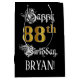 Dieses extravagante und luxuriöse Geschenktütendesign mit Geburtstagsgeschenk enthält die Meldung "Happy 88 th Birthday" und einen bearbeitbaren Empfängernamen. Ein Teil der Nachricht ist in einem ausgefeilten Skripttext enthalten, die große Zahl "88." weist ein Imitat/Imitation in Gold inspiriert Erscheinungsbild auf, und der Hintergrund ist schwarz. Eine Geschenktasche wie diese kann verwendet werden, wenn Sie ein Geschenk oder Geschenk zu Ehren von jemandem achtundachtzig Geburtstag. [~Z0000560]