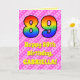 Die Vorderseite dieses fröhlichen und festlichen 89. Geburtstags Thema Grußkarte Design zeigt eine große Zahl "89" mit einem farbenfrohen Regenbogenspektrum inspiriert Farbverlauf. Es enthält auch die Meldung "Happy 89th Birthday", und einen personalisierten Empfängernamen. Der Hintergrund der Vorderseite ist mit einem dunkelrosa und hellrosa Streifen mit liebevollen rosa Herzformen versehen. Im Inneren befindet sich eine personalisierte Geburtstagsgrüßbotschaft, oder man könnte sie löschen und leer verlassen werden, wenn eine Nachricht von Hand geschrieben werden soll. Eine individuell gestaltbare Geburtstagskarte wie diese könnte eine lustige Art sein, Geburtstagswünsche an jemanden zu senden, der gerade seinen neunundachtzigsten Geburtstag feiert. [~Z0000416]