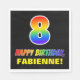 Dieses farbenfrohe, fröhliche und lustige Geburtstagspapier serviert eine große Zahl "8" und die Meldung "HAPPY BIRTHDAY", beide mit einem inspirierten Farbverlauf des Regenbogenspektrums, zusammen mit einem kühnen gelben personalisierten Empfängernamen. Der Hintergrund ist schwarz. Spaß, maßgeschneiderte Geburtstagsthemen wie diese werden bei Jemandem zum 8. Geburtstag gefeiert. [~Z0000476]