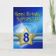 Ein großer glänzender goldener Stern, in den man den Namen des Geburtstagsjungen setzen kann. Der Hintergrund ist blau mit hübschen weißen Wirbel.