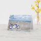 Ein blauer Motorrad stehend auf einem Strand mit flauschigen Wolken am Himmel. Alles Gute zum Geburtstag geschrieben in Stein reflektiert im Wasser auf dem Sand.