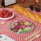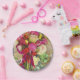 Ein lebhaftes, farbenfrohes, schönes Fotomontage-Design auf einer Papierdessert- oder Salatplatte. Ideal für Ihre eigenen Unterhaltung oder als Geschenk für die Gastgeberin. Ideal auch für Gastgeschenke. Rose, Pfannkuchen und Juwelen machen dies zu einem wunderschönen Design.