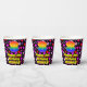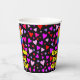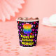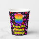 This fun and joyful birthday themed paper cup design a large number "8" with a rainbow spectrum gradient inspirred pattern, along with the message "Happy 8th Birthday", and a personalized name. The background feature a pattern of heart shapes with colors like pink, purple and red. Fun, happy paper cups like this might be fun to use at a birthday party being held to celebrate somebody's eighth birthday. [~ Z0000548]