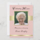Diese Einladung zum 90. Geburtstag ist sehr elegant. Das Design zeigt ihr Foto als Highlight mit einem goldenen Rahmen auf einer Rose goldenen Hintergrund. Auf beiden Seiten des Rahmens erscheinen goldene Bänder. Zusätzlich erscheint eine goldene Band ganz unten. Auf der Rückseite können Sie alle Ihre Einladungen auf einen goldenen Hintergrund setzen. Copyright henishouseuse paper