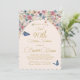 Eine 90. Geburtstags-Floral Personal Monogram Geburtstagseinladung mit einer eleganten Field Blume oder Wildblumen und Schmetterlinge. Das Alter kann für jedes Alter geändert werden, nicht nur für 90. Die Informationen können leicht auf Ihre eigenen persönlichen Informationen geändert werden, wobei das Wort Überraschung entfernt werden kann, das Alter geändert wird. Die Rückseite hat einen persönlichen Namen mit dem gleichen eleganten Skript wie die Einladung.