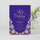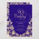 Lila goldfarbene elegante 90. Geburtstagsfeier. Klassisches Design mit Rose, Imitaten Goldfolie und Typografie Script Schriftart. Die trendige Einladungskarte eignet sich perfekt für eine stilvolle Damenfeier. Personalisieren Sie Ihre persönlichen Daten. Kann für jedes Alter angepasst werden. Gedruckte Zazzle-Einladungen oder Sofortdownload digitaler Druckvorlage.