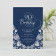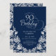 Navy silber elegante 90. Geburtstagsfeier Einladung. Klassisches Design mit Rose, Imitaten Silberfolie und Typografie Script Schriftart. Die trendige Einladungskarte eignet sich perfekt für eine stilvolle Damenfeier. Personalisieren Sie Ihre persönlichen Daten. Kann für jedes Alter angepasst werden. Gedruckte Zazzle-Einladungen oder Sofortdownload digitaler Druckvorlage.