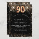 Eine moderne, stilvolle und glamouröse Einladung zu einer 90. Geburtstagsfeier. Ein schwarzer Hintergrund mit goldenem Imitat Glitzer, Glitzern. Der Name ist mit einem modernen handgeschriebenen Stilskript geschrieben. Personalisieren Sie Ihre Party-Daten und fügen Sie sie hinzu. Nummer 90 wird mit einem Schriftart im Ballonstil geschrieben, Skript.
