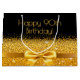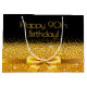 Elegante, klassische, glamouröse und feminine Geschenktasche. Ein Imitat goldfarbenes Band und Bogen. Schwarzer Hintergrund. Mit dem Text: Happy 90. Geburtstag!